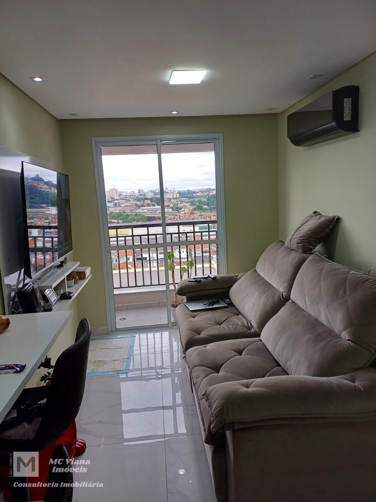 Descubra o conforto e a praticidade neste charmoso apartamento, ideal para quem busca um lar funcional e bem planejado. A sala de estar, equipada com ar-condicionado, se integra a uma cozinha compacta e moderna, que conta com cooktop e geladeira embutida. O balcão central com duas banquetas cria um espaço perfeito para refeições rápidas e descontraídas. A sala ainda se conecta a uma varanda com vista, garantindo um ambiente arejado e iluminado, perfeito para relaxar.