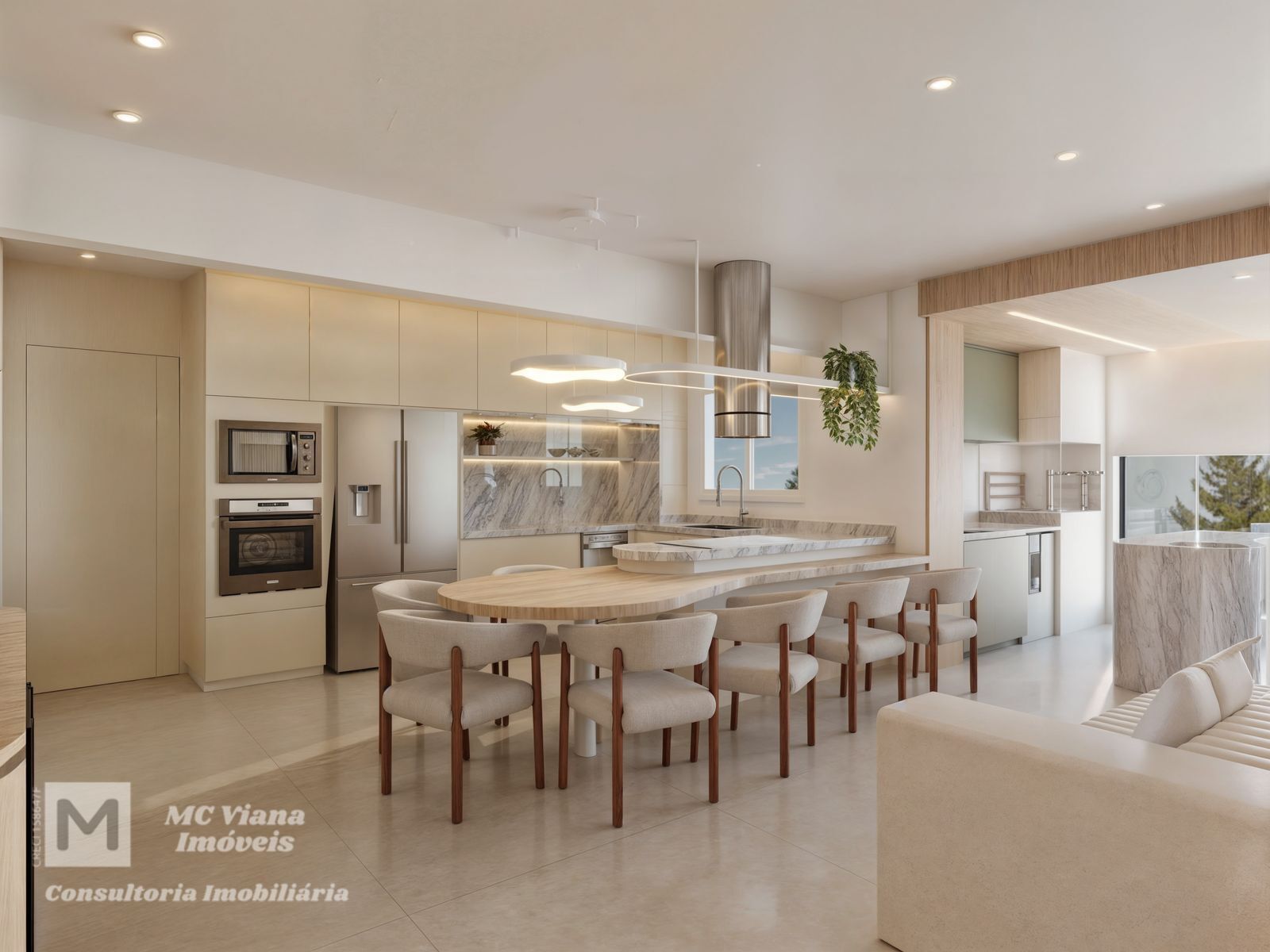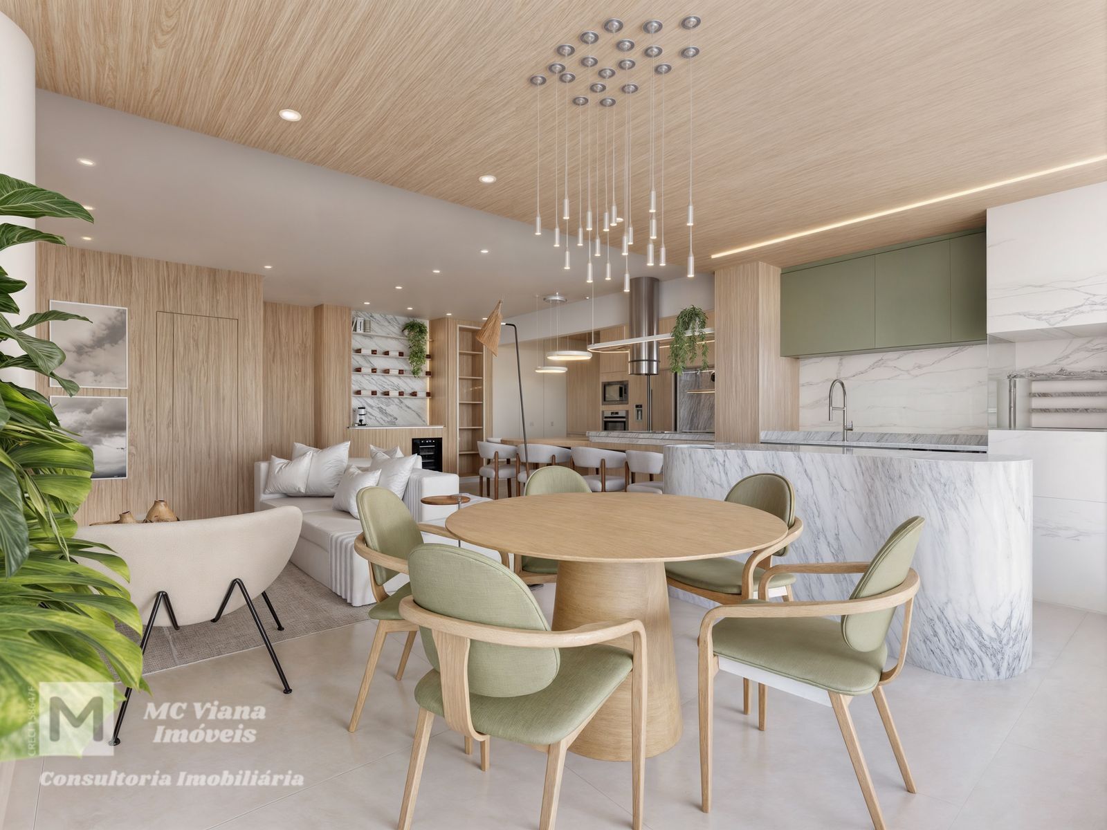 Descubra o auge do design contemporâneo neste apartamento de alto padrão. O living em conceito aberto une sala de estar, jantar e cozinha gourmet em um fluxo elegante, ideal para receber. O projeto de interiores exibe uma paleta de cores claras e neutras, harmonizada com a sofisticação da madeira clara e do mármore, garantindo luminosidade e um ambiente acolhedor e exclusivo, com destaque para a marcenaria planejada e iluminação em LED.