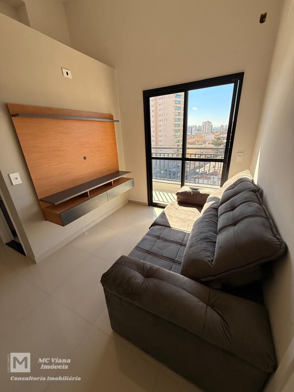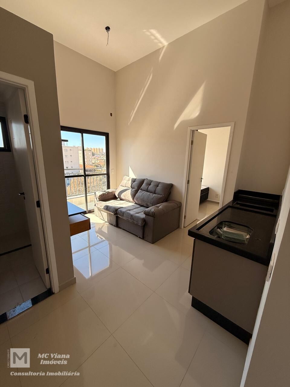 O Condomínio Prime Studios Vila Galvão apresenta um imóvel moderno e bem iluminado, ideal para quem busca praticidade e conforto. As fotos mostram um espaço integrado de sala e cozinha, com um balcão em granito escuro, e uma sala com um sofá e um painel de TV, além de acesso a uma varanda. A iluminação natural é um destaque, com grandes janelas e uma porta de vidro que leva à sacada.