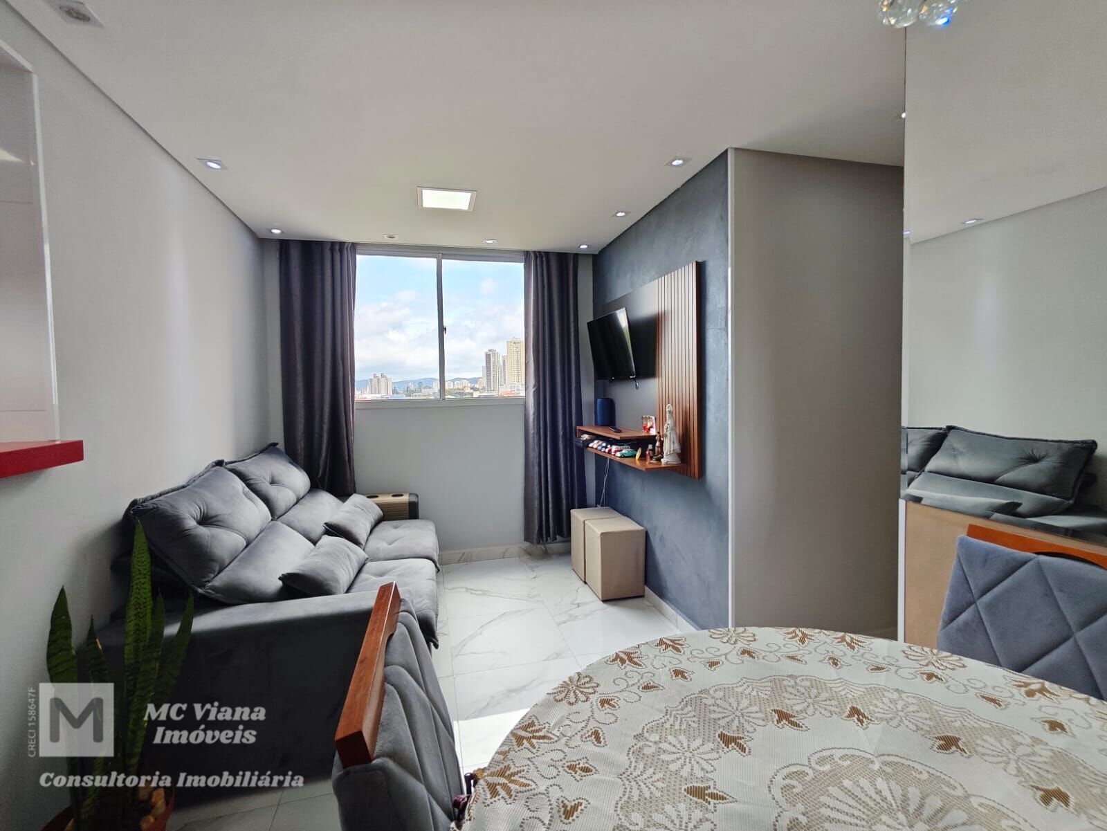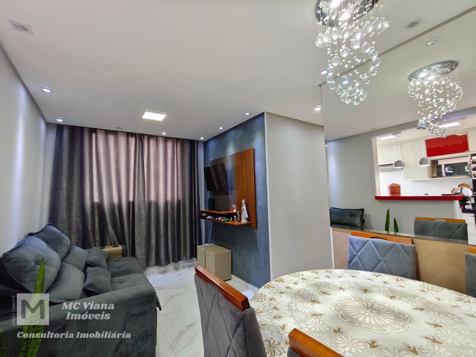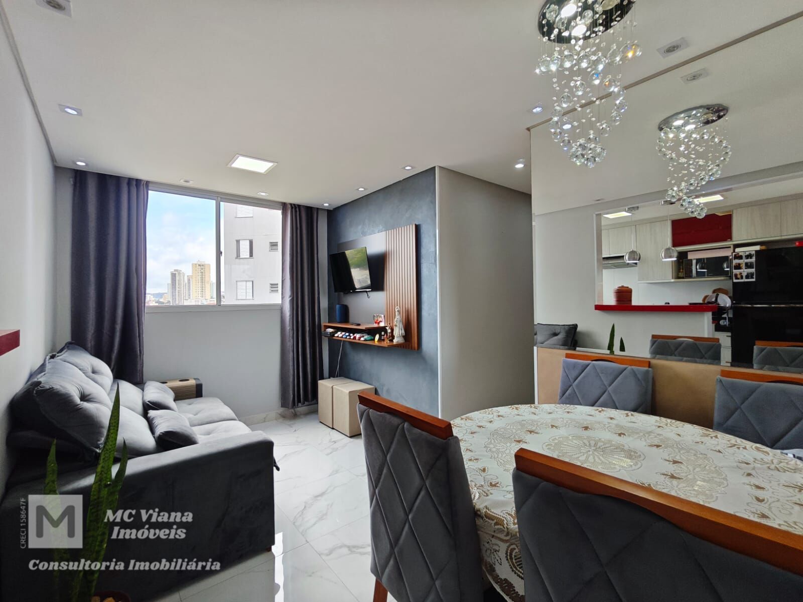 Este sofisticado apartamento une modernidade e conforto em ambientes cuidadosamente planejados. A área social se destaca pelo conceito aberto, integrando uma sala de estar com acabamento em cimento queimado e iluminação embutida a uma cozinha americana vibrante, equipada com bancadas em quartzo vermelho e móveis planejados de alto padrão. O piso em porcelanato marmorizado percorre todo o imóvel, conferindo amplitude e elegância.