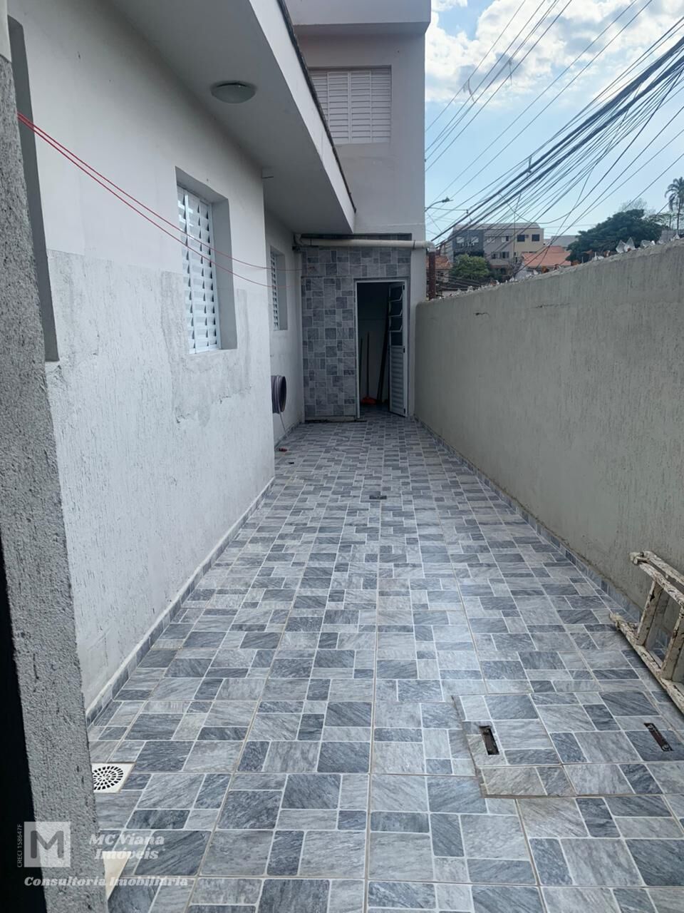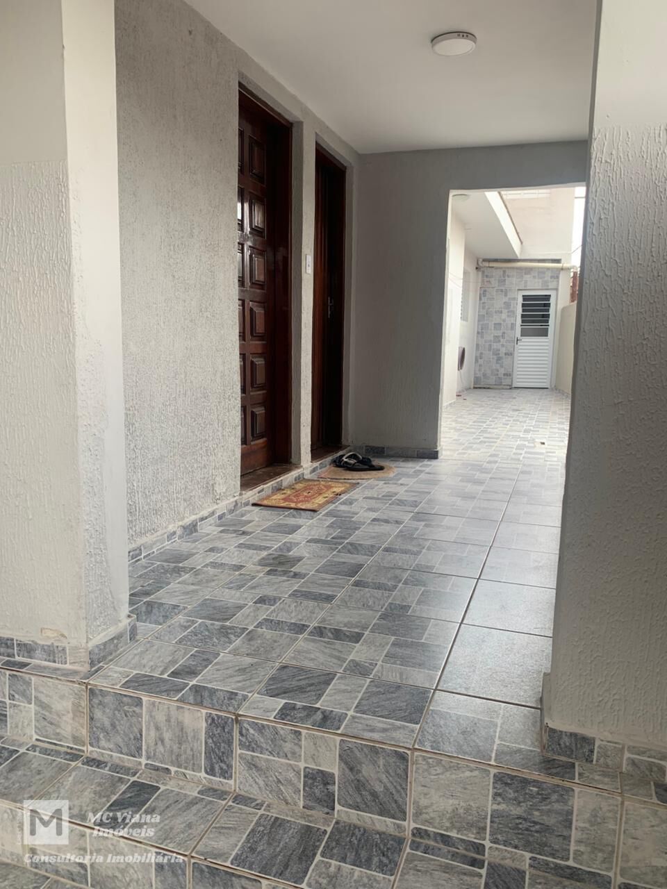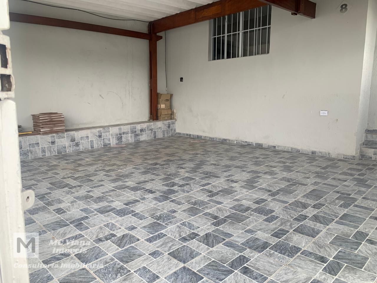 Na área externa, o imóvel se destaca por uma garagem com teto alto, revestida com piso de cerâmica, ideal para proteger o carro e ainda oferecer espaço adicional para lazer ou armazenamento. Há também um corredor lateral que leva a uma área de serviço externa, e uma escada que dá acesso ao piso superior. O piso de cerâmica, presente em toda a casa, facilita a limpeza e manutenção. A fachada, com acabamento texturizado, completa o visual do imóvel.