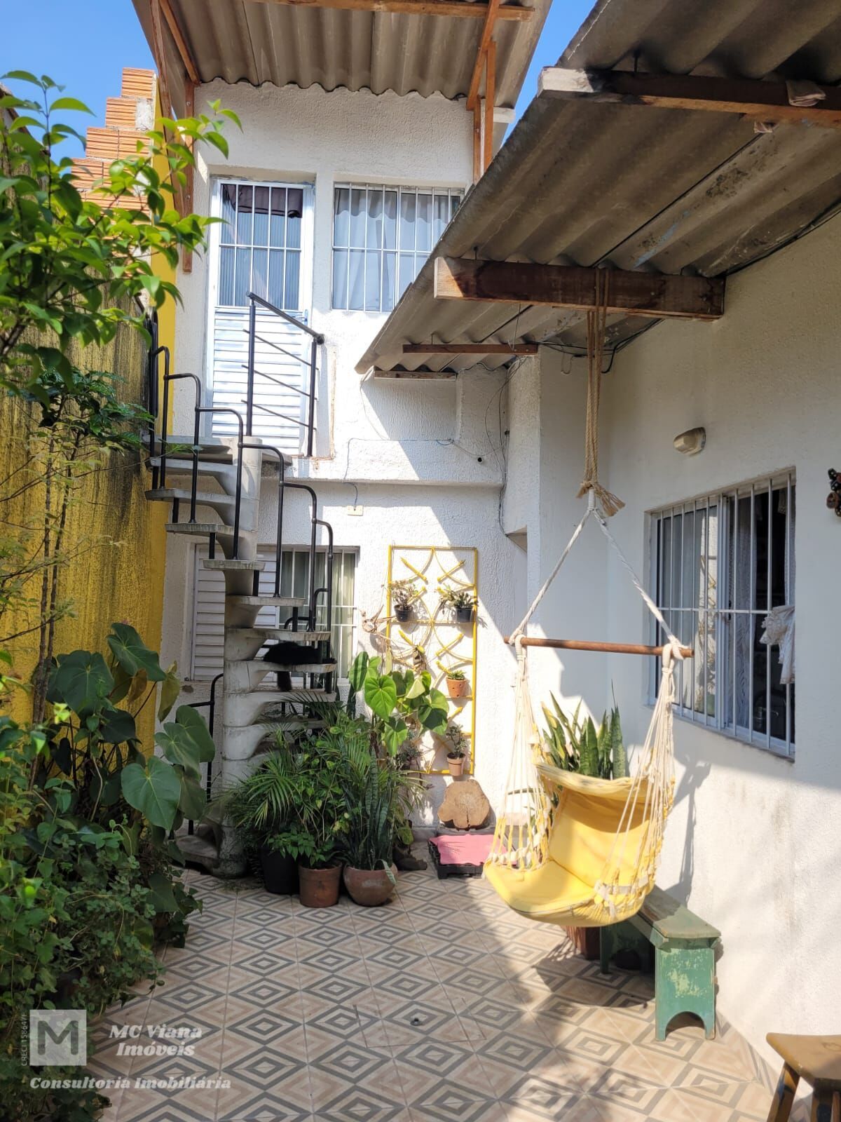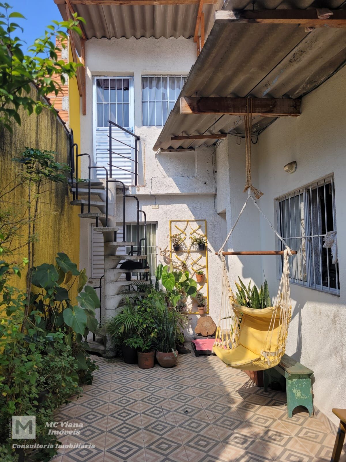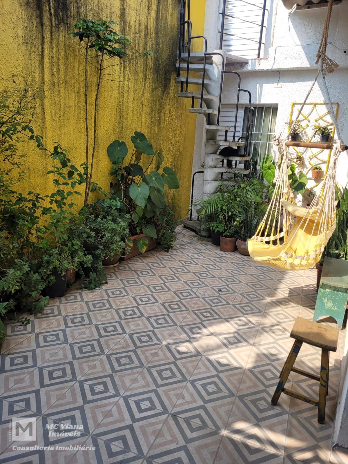 O grande diferencial é o seu pátio privativo, um verdadeiro oásis urbano. Este espaço é banhado pelo sol e chama a atenção pelas paredes amarelas vibrantes e o piso geométrico decorado. É um local perfeito para relaxar, equipado com um balanço/rede suspenso e um exuberante jardim tropical, incluindo um painel de jardim vertical metálico. A escada caracol em concreto e ferro adiciona um toque arquitetônico único, ligando o térreo ao piso superior.