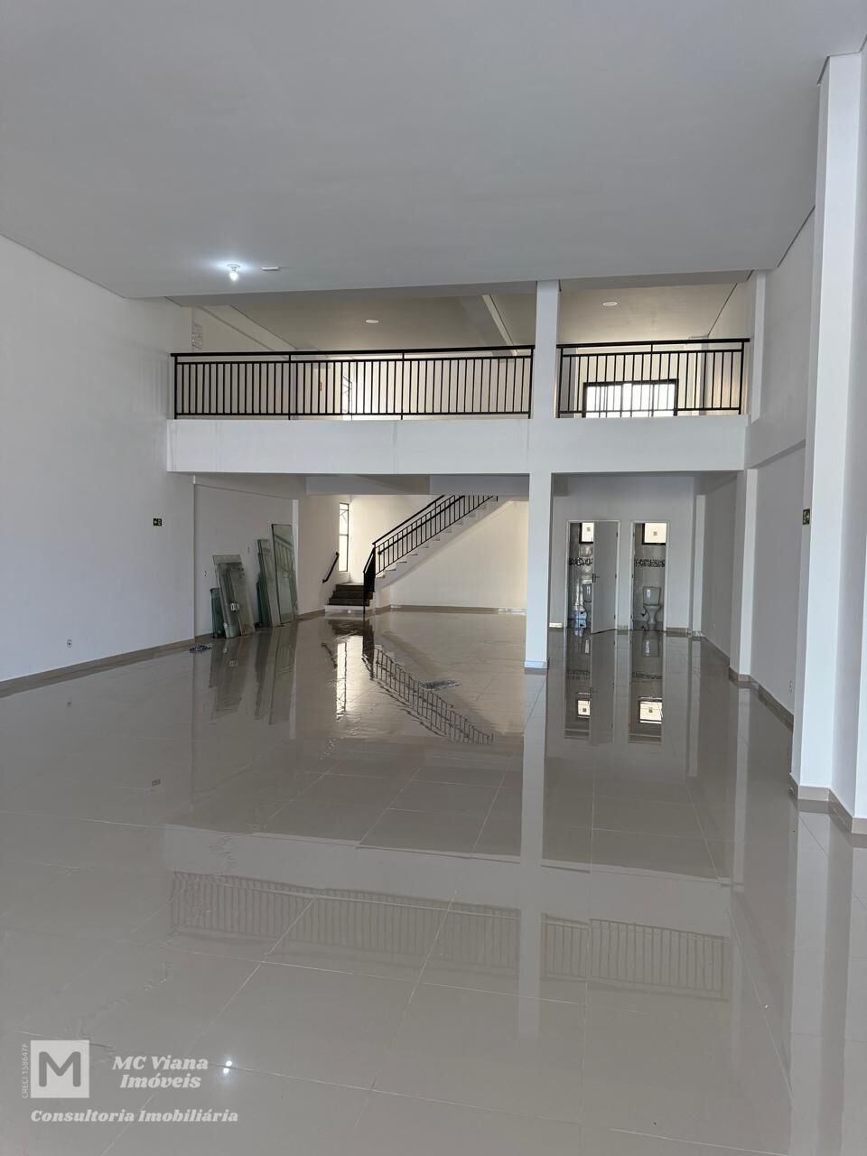 O mezanino é um diferencial importante, proporcionando um espaço adicional versátil que pode ser usado como área de reuniões, escritórios privativos ou até mesmo como um lounge. A escadaria com corrimão em metal e o design em balcão reforçam o aspecto sofisticado do local.